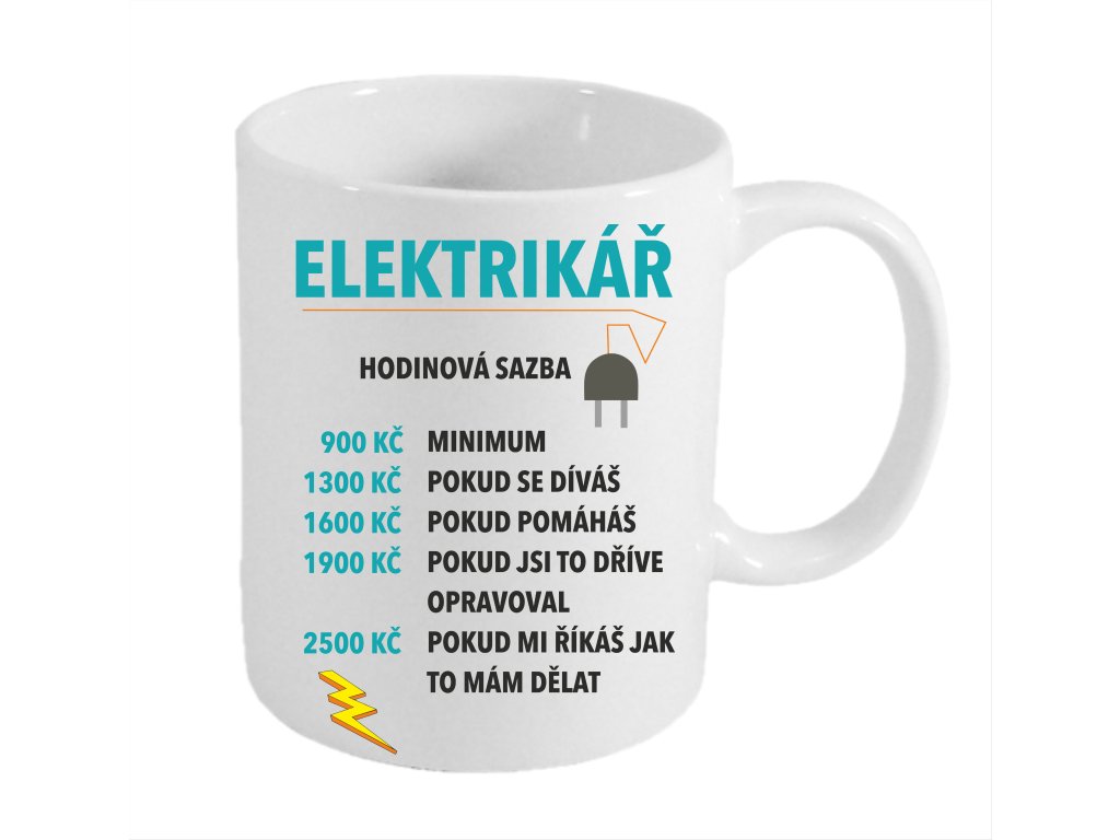 Originální keramický hrnek s oboustranným potiskem „Hodinová sazba elektrikáře“ – vtipný dárek pro každého, kdo má napětí v malíku!