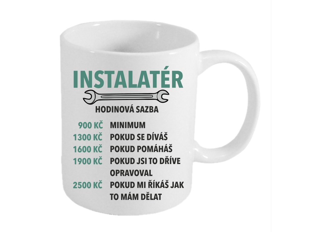 Hledáte originální dárek pro instalatéra, který má zlaté ruce a smysl pro humor? Tento keramický hrnek s oboustranným potiskem hodinové sazby instalatéra potěší každého řemeslníka, který ví, že bez něj by se svět prostě netočil.