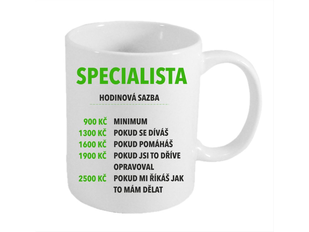 Hledáte originální dárek pro specialistu, který bere svou práci vážně, ale má i smysl pro humor? Tento keramický hrnek s oboustranným potiskem hodinové sazby specialisty potěší každého experta, který ví, že kvalitní práce něco stojí – a rozhodně za to stojí!