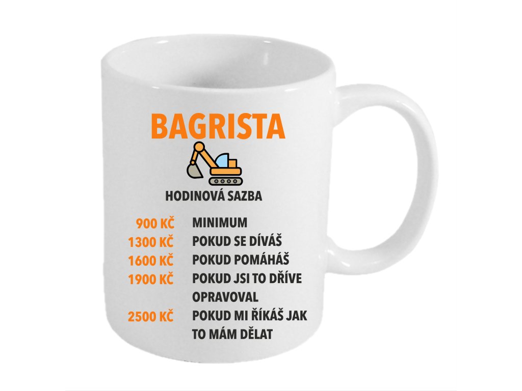 Hledáte originální dárek pro bagristu, který miluje svůj stroj a bere práci s humorem? Tento keramický hrnek s oboustranným potiskem hodinové sazby bagristy potěší každého chlapa za pákami bagru i každého, kdo pracuje na stavbě.