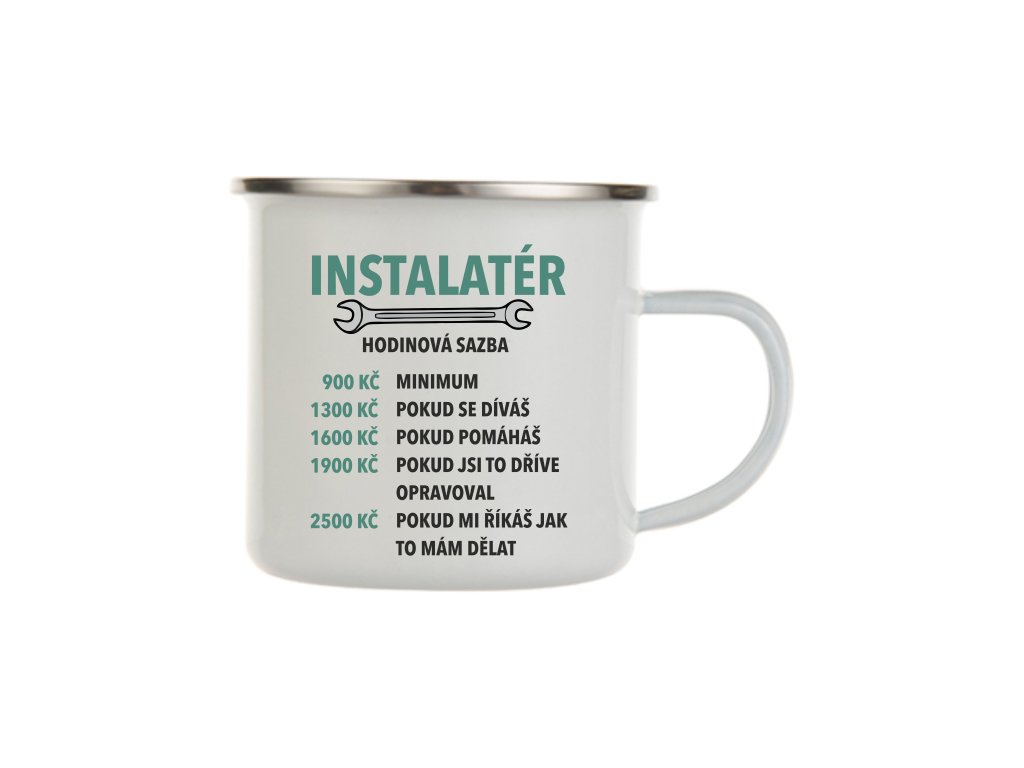 Originální plechový hrnek s oboustranným potiskem „Hodinová sazba instalatéra“ – vtipný dárek pro každého mistra trubek a těsnění!