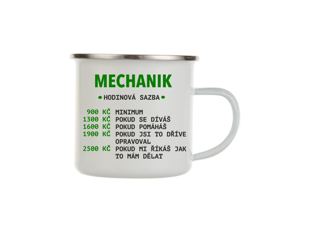 Originální plechový hrnek s oboustranným potiskem „Hodinová sazba mechanika“ – vtipný dárek pro chlapa, který umí spravit všechno!