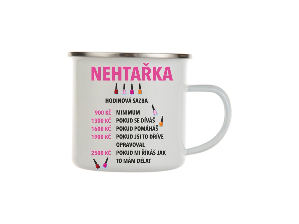 Originální plechový hrnek s oboustranným potiskem „Hodinová sazba nehtařky“ – stylový a vtipný dárek pro ženy, které tvoří krásu nehtů!