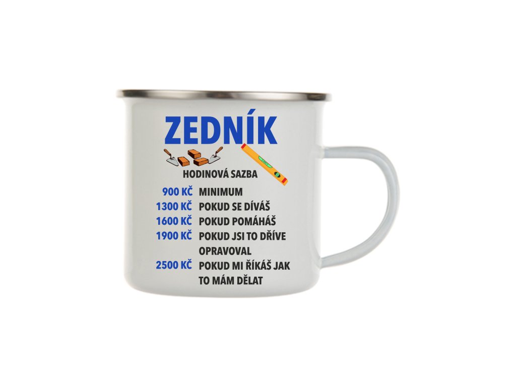 🧱 Originální plechový hrnek s oboustranným potiskem „Hodinová sazba zedníka“ – dokonalý dárek pro každého mistra!