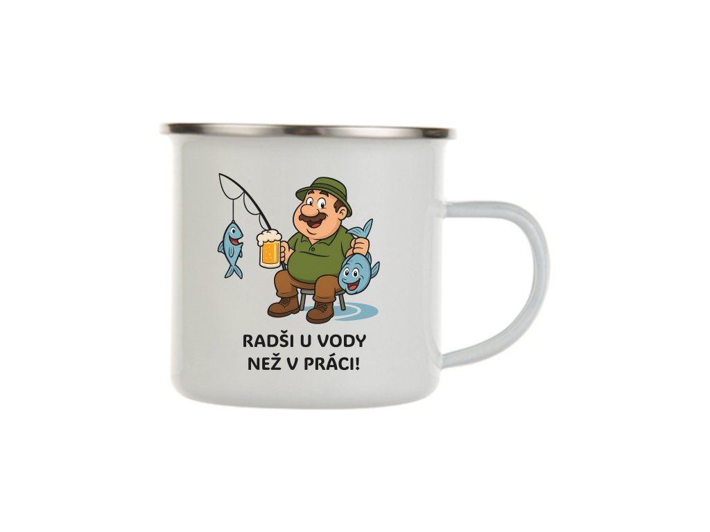 Originální plechový hrnek s potiskem „Radši u vody než v práci!“ – ideální dárek pro každého rybáře!
